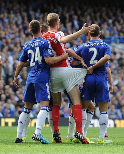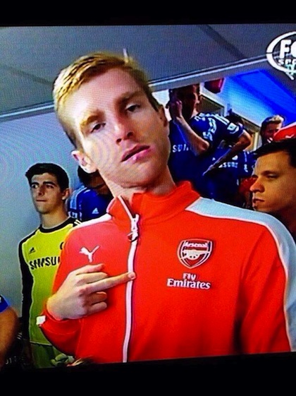 Напрежението около дербито Челси - Арсенал завладя всички - както фенове, така и главните действащи лица. Цял свят видя как мениджърите Арсен Венгер и Жозе Моуриньо за малко не се сбиха. Камерите от тунела обаче показаха още един интересен момент. Секудни преди излизането на игрището защитникът на гостите Пер Мертезакер размаха среден пръст на записващите устройства.