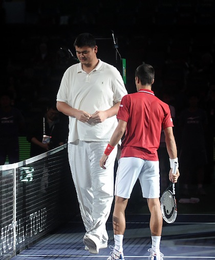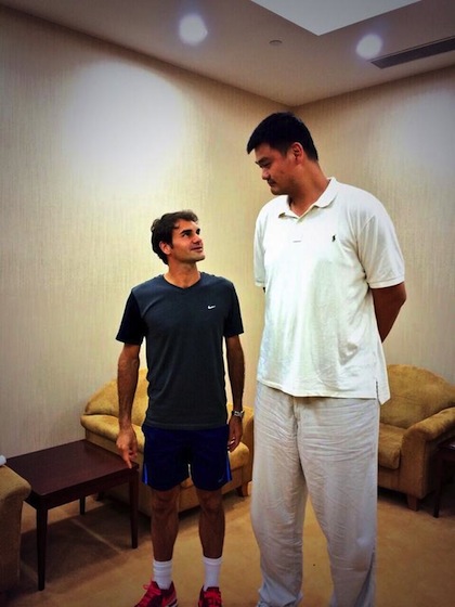 Бившият китайски баскетболист Яо Мин се срещна с двама от най-силните тенисисти на планетата в последните години - световния №1 Новак Джокович и Роджър Федерер. Това се случи в Шанхай, където сърбинът и швейцарецът продължават участието си на турнира от серията "Мастърс". Федерер е висок 185 см, а Джокович - 188, но и двамата изглеждат нисички на ръст до бившия център на Хюстън Рокетс, който стряска със своите 229 см.