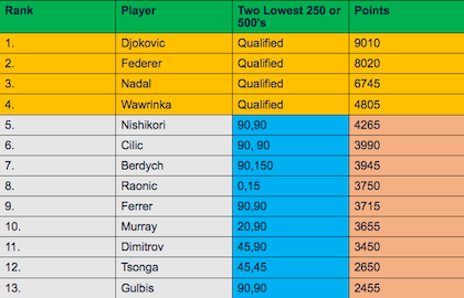 Това означава, че Давид Ферер, който е на 9-о място в класирането и само на 35 точки от 8-ия Милош Раонич, трябва задължително да достигне до финала във Виена, където играе с "уайлд кард", за да увеличи резултата си. В същото време канадецът има общо 15 точки от най-слабите си два турнира в по-ниските категории и каквото и да направи през следващите две седмици ще бъде в плюс за него.