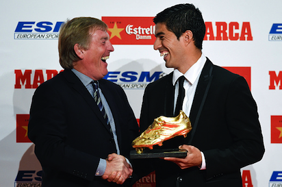 Нападателят на Барселона Луис Суарес получи "Златната обувка" за голмайстор на Европа за миналия сезон. Церемонията се състоя в каталунската столица, а наградата беше връчена на уругвайския национал от Кени Далглиш. Легендата на Ливърпул беше човекът, който привлече Суарес на "Анфийлд" през 2011 година от Аякс. През изминалата кампания Суарес отбеляза 31 гола във Висшата лига и подели приза със звездата на Реал Мадрид Кристиано Роналдо, вкара същия гол брой попадения в Примера дивисион.