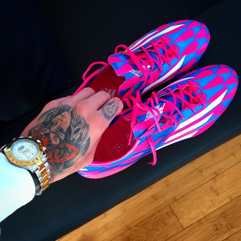 Левият бек на ЦСКА Тончи Кукоч показа бутонките, с които ще излезе в дербито с Левски в събота. Футболните обувки са на "Адидас", модел F50 adizero fg и са в розово, бяло и синьо.