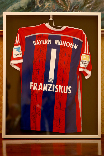 Капитанът Филип Лаам и шефът на мюнхенчани Карл-Хайнц Румениге връчиха на папа Бенедикт "синьо-червена" фланелка на клуба с номер 1 и неговото име на гърба.