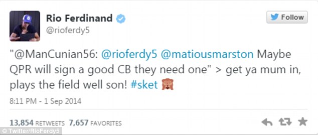 В случая написаното от Рио Фърдинанд е следното: в отговор на пост на негов последовател, препоръчващ на Куинс Парк Рейнджърс да привлекат добър централен защитник, защото не разполагат с такъв, Фърдинанд пише: "докарай майка ти, справя се добре на терен, синко! #уличница". Още по-интересен е фактът, че Фърдинанд използва думата "sket", която сама по себе си не означава нищо на английски. Изразът е уличен език и идва от английския, използван на Карибите. Въпреки това от ФА твърдят, че Фърдинанд е отправял "обиди на полова основа" и това е записано в доводите за наказанието на футболиста.