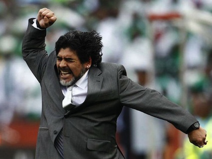 Марадона не си поплюва и в отношенията си с феновете. В ОАЕ той се нахвърля върху насядалите във VIP трибуната. Причината е в оскърбления от страна на арабите, облечени в традиционни одежди, към приятелката на футболиста. Тя си е позволила да се появи там, където е разрешено само за мъже, и то в особено "срамен" за арабските мерки вид: дълбоко деколте и къса поличка. Диего дълго наблюдава конфликта от треньорската скамейка, преди да скочи и да се понесе към трибуните за изясняване на отношенията.
