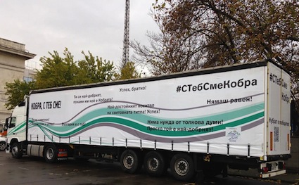 Специалният камион, върху чието ремарке всеки желаещ може да напише своите думи за кураж към Кобрата, ще събира посланията днес и утре, а в събота ще обикаля София като нетрадиционен движещ се билборд, за да допринесе за повдигането на духа и създаването на положителна атмосфера преди мача със световния шампион в супертежка категория за професионалисти Владимир Кличко.