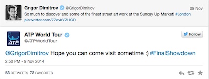 "Надяваме се, че ще ни посетиш някога:)", написаха от централата под пост на Григор Димитров в "Туитър", в който той се възхищава на уличното изкуство в Лондон.