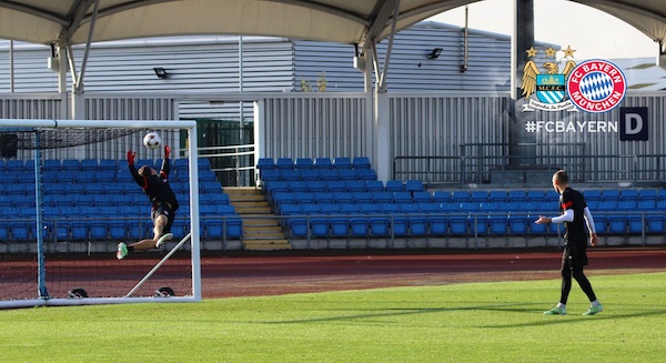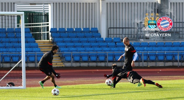 След като вече се класираха за осминафиналите в Шампионската лига, футболистите на Байерн (Мюнхен) се подготвят без никакво напрежение за днешния си мач с Манчестър Сити. На тонизиращата тренировка по-рано през деня вратарят Мануел Нойер изпълни една от мечтите си да играе като полеви футболист. Той участва в предни позиции при редица упражнения, като едно от тях беше да центрира в наказателното поле. Мястото му под рамката пък беше заето от Томас Мюлер и Бастиан Швайнщайгер, които видимо се забавляваха от това.