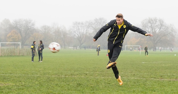 Изненадващо футболистите на Борусия (Дортмунд) отказаха да тренират днес на базата на Арсенал преди двубоя между двата тима от Шампионската лига тази вечер. Вместо това наставникът Юрген Клоп заведе играчите си в един от парковете в Лондон - "Regent Park", където има футболен терен. По пътя към мястото германците се разминаваха с обикновени хора, които бяха излезли на джогинг.