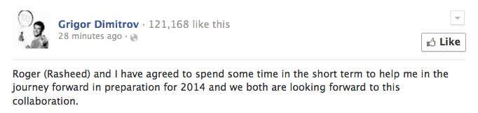 Най-добрият български тенисист Григор Димитров има нов треньор. Хасковлията обяви в страницата си във Фейсбук, че е постигнал споразумение с Роджър Рашид да работят заедно в подготовката за турнирите през 2014-а година. Двамата са много ентусиазирани за съвместната си работа и очакват с нетърпение да започнат тренировки. Димитров заяви, че с Рашид ще прекарат известно време заедно в краткосрочен план.