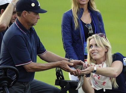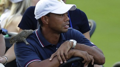 Американската скиорка Линдзи Вон се пошегува с гаджето си Тайгър Уудс на турнира в Охайо. Блондинката получи катеричка от човек от щаба на Тигъра и я постави върху гърба на любимия си, който бе в публиката и в този момент бе доста напрегнат, защото следеше как ще протече ударът на негов конкурент. Уудс обаче не се уплаши, какъвто бе търсеният ефект, а избута животното, пречещо му да гледа.