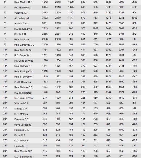 Безапелационен лидер в своеобразната ранглиста е Реал Мадрид с 4042 точки. Барселона е на втората позиция с 3924. Само Реал Мадрид, Барса и Атлетик Билбао до момента са играли във всеки един кръг в историята на испанския елитен шампионат - по 2618 мача. Десетката допълват Еспаньол (6-и), Севиля (7), Реал Сосиедад (8), Сарагоса (9) и Бетис (10).