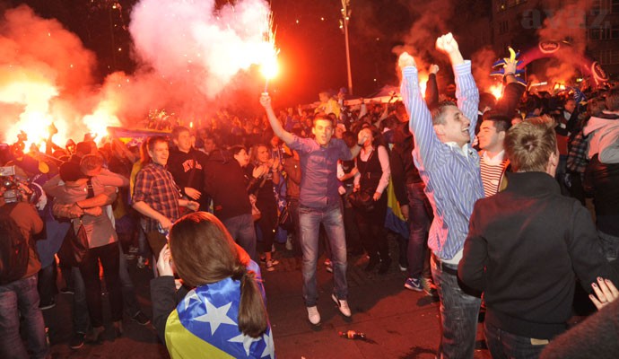 Луда нощ изпратиха жителите на Босна след историческото класиране на националния отбор на бившата югорепублика на световни финали. Над 10 000 фенове изпаднаха в делириум на централния площад в столицата Сараево, където гледаха мача с Литва на голям екран, след победния гол на Ведад Ибишевич в 68-ата минута. След последния съдийски сигнал на мача в Каунас камерите показаха просълзените от щастие футболисти. Сълзи на радост бликнаха и в очите на хилядите обикновени босненци.