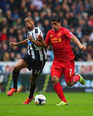 В 41-атна минута Суарес нахлу след извеждащ пас в наказателното поле на Нюкасъл, Мапу Янга-Мбива го задържа с ръка и реферът Андре Маринър посочи бялата точка - дузпа за "червените" плюс червен картон за
