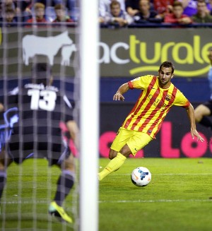 При следващата каталунска атака малко не стигна на Неймар да застигне топка пред стража на наварци. В 39-ата Педро изпълни удар от въздуха, но Алехандро Арибас сложи крак. В 44-ата Марк Бартра беше оставен сам при корнер, но с глава от осем метра стреля над гредата. През първата част Барса игра с желание в атака, но не създаде достатъчно положения. Много дейно участваха бековете Монтоя и Адриано. Първият удар на Осасуна дойде в 45-ата минута, когато Виктор Валдес улови далечен изстрел на Роберто Торес.