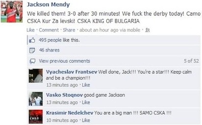 Бранителят на ЦСКА Джаксън Менди бе на седмото небе от радост след победата над Левски с 3:0. Това бе първо участие във вечното дерби за французина и той не пропусна да изрази емоциите си във фейсбук, където вече "блесна" с няколко любопитни статуса и снимки от идването си в България. Малко след края на двубоя Менди написа: "Убихме ги! 3:0 за 30 минути!". Следва традиционното "Само ЦСКА!, допълнено от популярно обидно скандиране на феновете на "червените" спрямо Левски. Статусът на Менди завършва с ЦСКА - кралете на България".