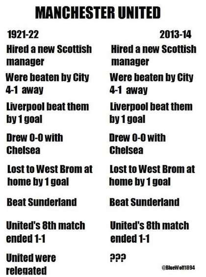 Сезон 2013/2014 започва да прилича много на сезон 1921/1922 за Манчестър Юнайтед. Разбира се, 92 години не са никак малък период от време, но приликите са много любопитни.