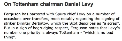Отрязък след отрязък от автобиографията на сър Алекс Фъргюсън заливат британската преса. Върху много интересен епизод от книгата хвърля светлина вестник "Лондон Ивнинг Стандард". Според изданието легендарният мениджър нарича трансфера на българския нападател Димитър Бербатов "голяма борба" (б.р. - на англ. език - "a scrap"*). "Фъргюсън се е борил многократно с шефа на Тотнъм Даниел Леви, като най-явният случай е за трансфера на Димитър Бербатов, който той нарича "голяма борба". Фъргюсън признава, че Леви винаги мисли за Тотнъм, което "не е лошо нещо", пише още "Ивнинг Стандард".