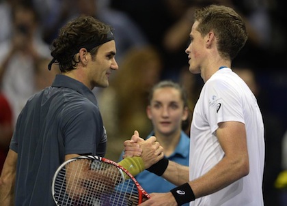 За Федерер утрешният мач ще бъде общо 10-о участие на финала в Базел в кариерата му. Федерер имаше шанс да сервира за 40-ата си победа от началото на сезона при 6:3 и 5:3 в своя полза, но допусна пробив. 23-годишният Поспишил изравни за 5:5 и малко след това се стигна до тайбрек. В него Поспишил поведе с 3:0, Федерер намали изоставането си на 3:4, но канадецът взе следващите три точки и вторият финалист трябваше да бъде определен след решаващ трети сет.