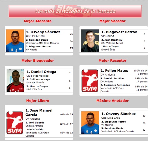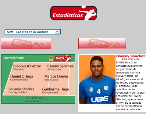 Посрещачът на Волей Плая (Мадрид) заби 26 точки (4 аса, 3 блока, 50% ефективност в атака, 22% перфектно и 42% позитивно посрещане), но неговият тим Волей Плая (Мадрид) падна у дома от Л'ия Грау (Кастейон) с 2:3 (28:26, 25:23, 19:25, 19:25, 10:15) в мач от 4-ия кръг.