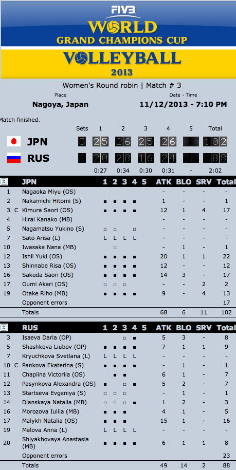 Възпитаничките на Масайоши Манабе стартираха двубоя изключително силно и спечелиха първата част с 25:20. Русия успя да вземе трудно втората част с 28:26, но следващите две бяха отново за Япония.