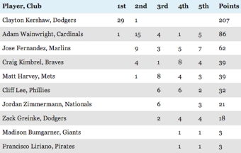 25-годишният Кършоу, който спечели приза и през 2011 г., бе поставен на първо място в 29 от общо 30 анкетни карти и веднъж бе посочен втори в Националната лига. Така асът на "мошениците" събра 207 т., разпределяни по системата 7-4-3-2-1 до 5-о място. Втори във вота се нареди питчерът на Сейнт Луис Кардиналс Адам Уейнрайт с 86 т., а трети е "Новобранецът на годината" на Маями Марлинс Хосе Фернандес с 62 т.