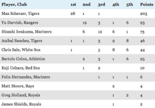 Същевременно 29-годишният Шързър триумфира с почти единодушна подкрепа в Американската лига, събирайки 203 т. от 28 първи, 2 втори и 1 трето място в 30-те анкетни карти. Далеч зад него останаха двама японски подгласници – Ю Дарвиш от Тексас Рейнджърс е втори с 93 т., а Хисаши Ивакума от Сиатъл Маринърс е трети със 73.
