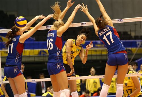Олимпийските шампионки от Бразилия обърнаха европейските първенци от Русия с 3:1 (18:25, 25:18, 25:22, 25:19) в мач от 4-ия кръг на турнира за Купата на шампионите, който се игра в зала "Метрополитън Джимнезиум" в Токио пред 6000 зрители.