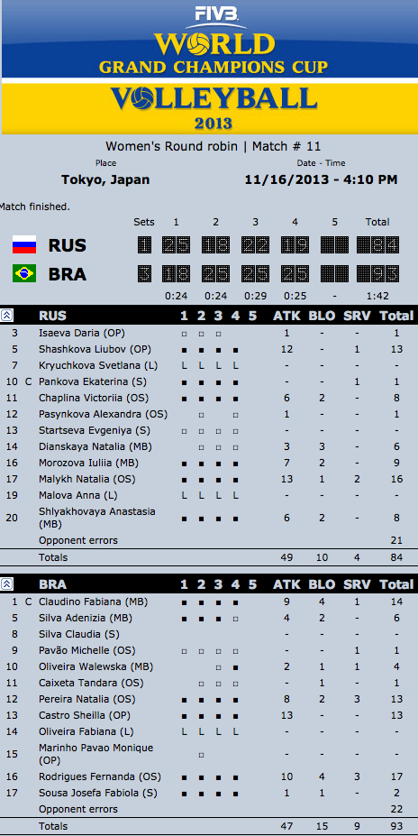 За Русия, която записа 3-та загуба от 4 мача на турнира, най-резултатна стана Наталия Малик с 16 точки (2 аса, 1 блок), а опитната 35-годишна Любов Шашкова-Соколова се отчете с 13 точки (1 ас).