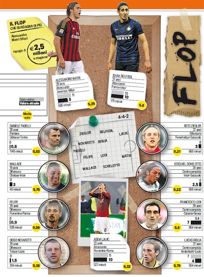 Идеалния отбор на трансферните провали: Падели (Торино); Уолъс (Интер), Фелипе (Парма), Новарети (Лацио), Циглер (Сасуоло); Скелото (Сасуоло), Лоди (Дженоа), Биля (Лацио); Белфодил (Интер), Матри (Милан), Ляич (Рома).