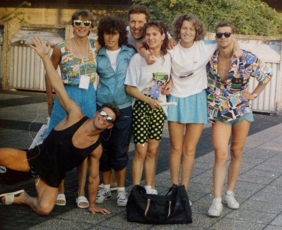 С асовете на българското плуване от 80-те години на миналия век (отляво на дясно): голямата й съперничка Таня Богомилова, Цветан Голомеев, Невяна Митева, Адриана Борисова, Михаил Савов и Георги Михалев (на предния ред)