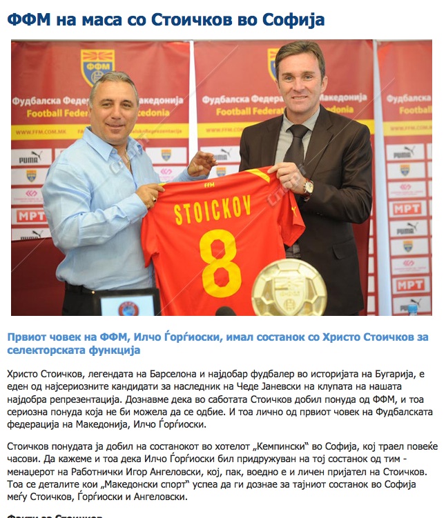 Христо Стоичков е сред най-сериозните кандидати за поста национален селекционер на Македония, съобщава местният вестник "Македонски спорт”. Според изданието миналата събота в столичния хотел "Кемпински" се е състояла среща между него и президента на Македонската футболна федерация Илчо Георгиевски. Вестникът публикува и кратка визитка на Стоичков за футболната и треньорската му кариера.