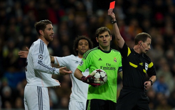 В 25-ата минута Серхио Рамос подцени подаване към Умут Бюлут и позволи на турчина да се откъсне. Последва задържане от страна на испанския национал, който закономерно получи директен червен картон. В интерес на истината нападателят на Галатасарай малко преигра в ситуацията, но задържане имаше и съдията Уилям Колъм взе правилното решение. Анчелоти реагира като извади Хесе и пусна защитника Начо Фернандес.