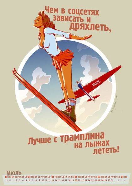 Всяка снимка в календара е придружена със стих. Цветовата палитра отговаря на стила - червено, бяло и синьо. Момичетата са нарисувани в класически пин-ъп пози, но със съветски плам в очите им.