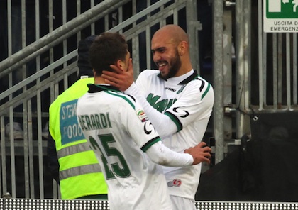 Възроденият Сасуоло пропусна да си тръгне с трите точки от Сардиния, след като допусна изравняване от 2:0 до 2:2 срещу Каляри в двубой от 14-ия кръг на Серия "А". Нов силен мач изнесоха младоците Симоне Дзадза и Доменико Берарди, които са в основата на прогреса на новаците в елита. В 14-ата минута Берарди асистира на Лино Мардзорати, който с глава даде аванс на Сасуоло. След още пет минути Берарди подаде и на Дзадза, който направи 2:0 за "черно-зелените".