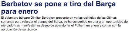 Междувременно в Каталуня отново заговориха за възможността Димитър да премине в Барселона през януари. Повод за слуховете са информациите в Англия, че "деветката" иска да напусне "Крейвън Котидж". Според вестник "Спорт" Бербатов е план "Б" за "блаугранас", като първи в списъка са Робин ван Перси и Серхио Агуеро.