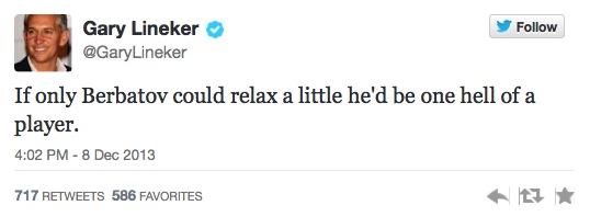 Легендата на британския футбол Гари Линекер пък отправи съвет към 32-годишния реализатор. "Само ако Бербатов можеше да се отпусне малко, би бил истински звяр на терена", написа бившият нападател на Барселона в Twitter.
