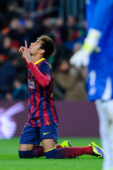 В 28-ата съдията Иглесиас Вийянуева спорно посочи бялата точка. Жорди Алба свали топката към ръката на Марио Гаспар. Топката се удари в горния крайник, който не направи движение към кълбото. Неймар изпълни ефектно и прецизно дузпата - 1:0 и пети гол в Примера.