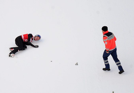 След скок от 141 метра, трикратният олимпийски шампион загуби равновесие, удари тежко главата си в земята, след което продължи да се търкаля по твърдата повърхност.