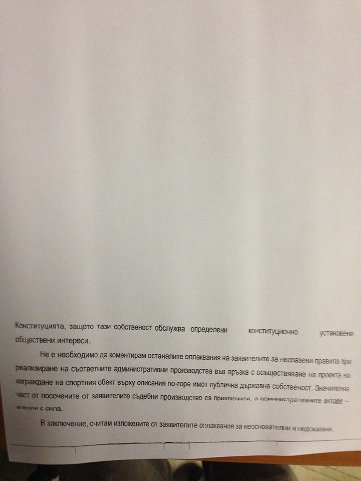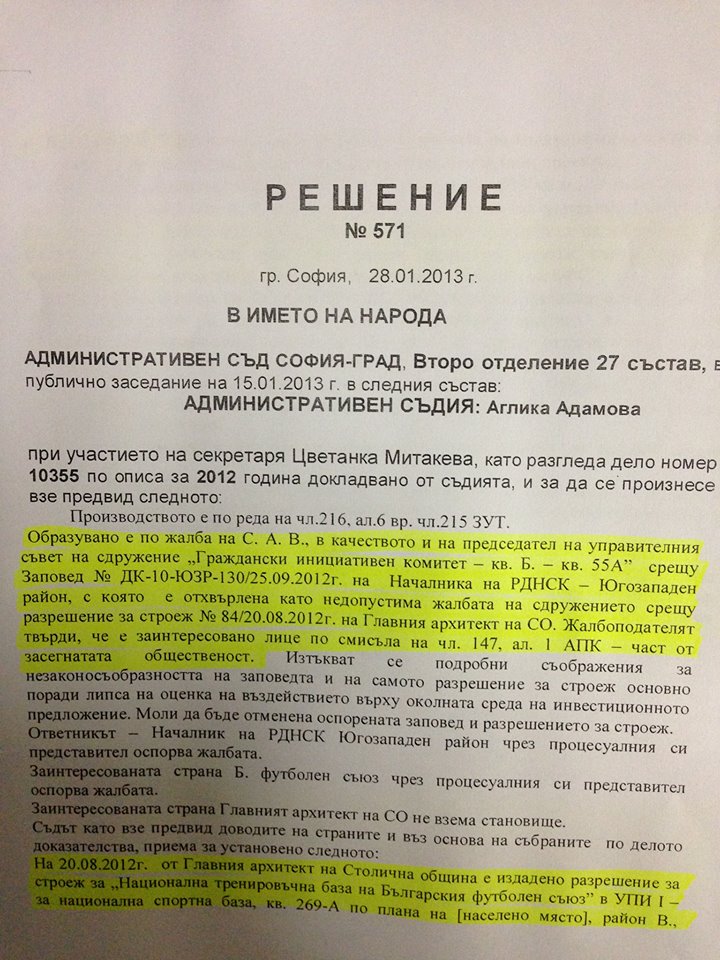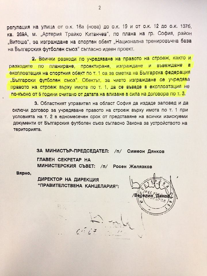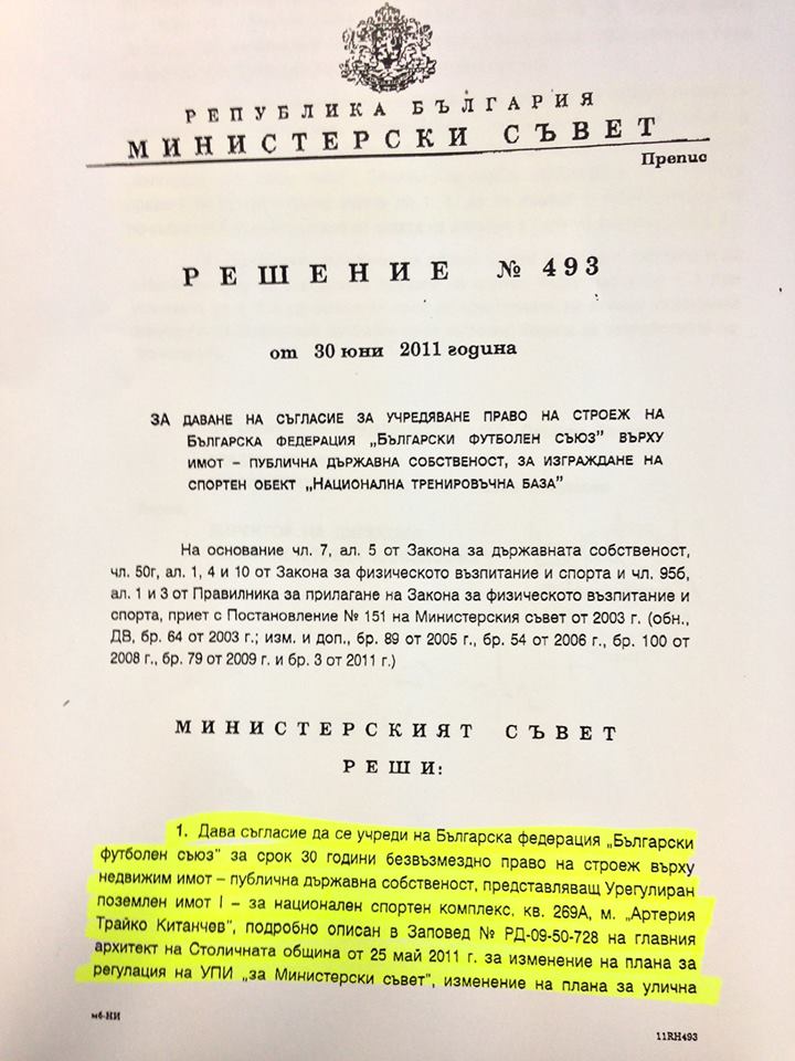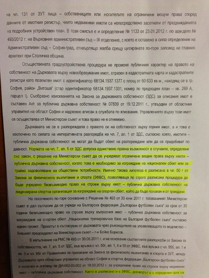 Това е решение на Министерски съвет за безвъзмездно право на строеж. И то е напълно законно според съда, защото земята не си променя статута - тя си остава държавна, както и всичко построено на парцела след 28 г. ще премине в ръцете на държавата. Безвъзмездното право на строеж е задължително условие от УЕФА към всички федерации - един вид: даваме ви пари да направите хубави бази, но трябва и държавата да участва със земя.