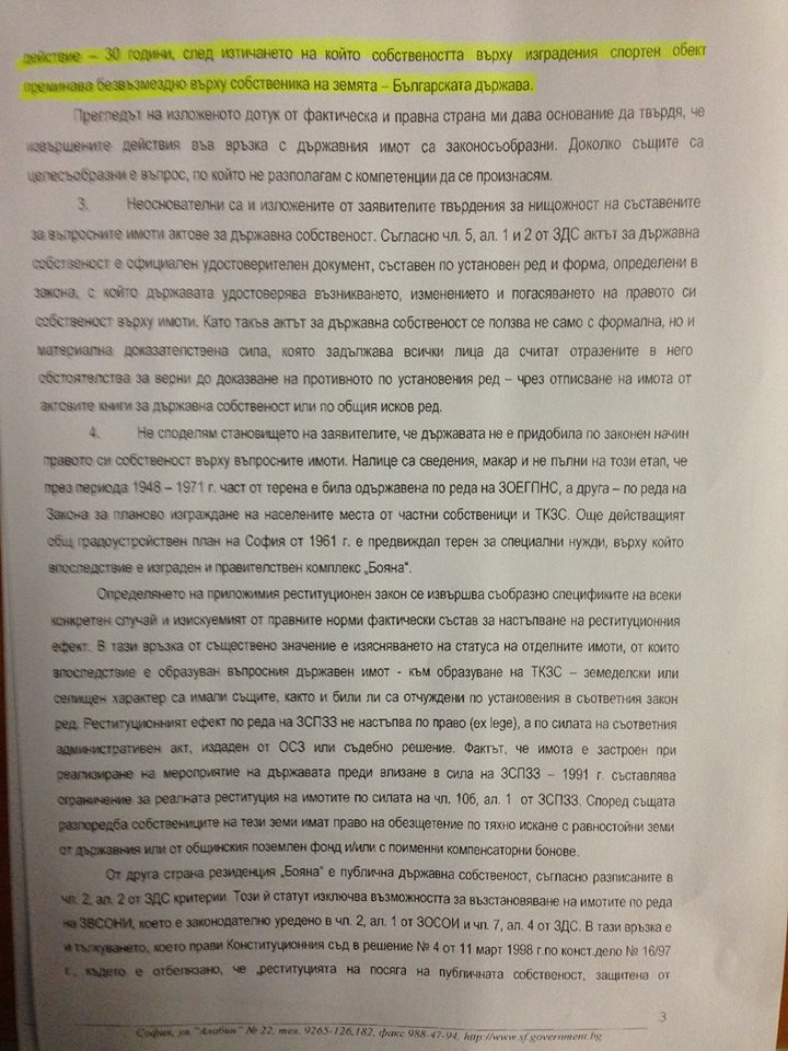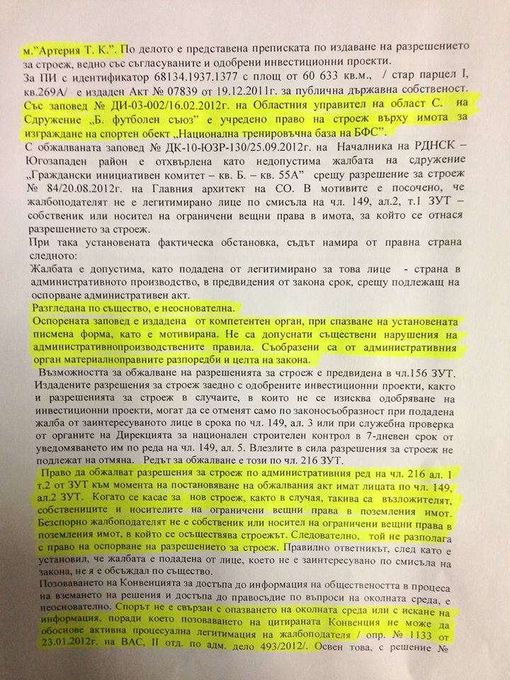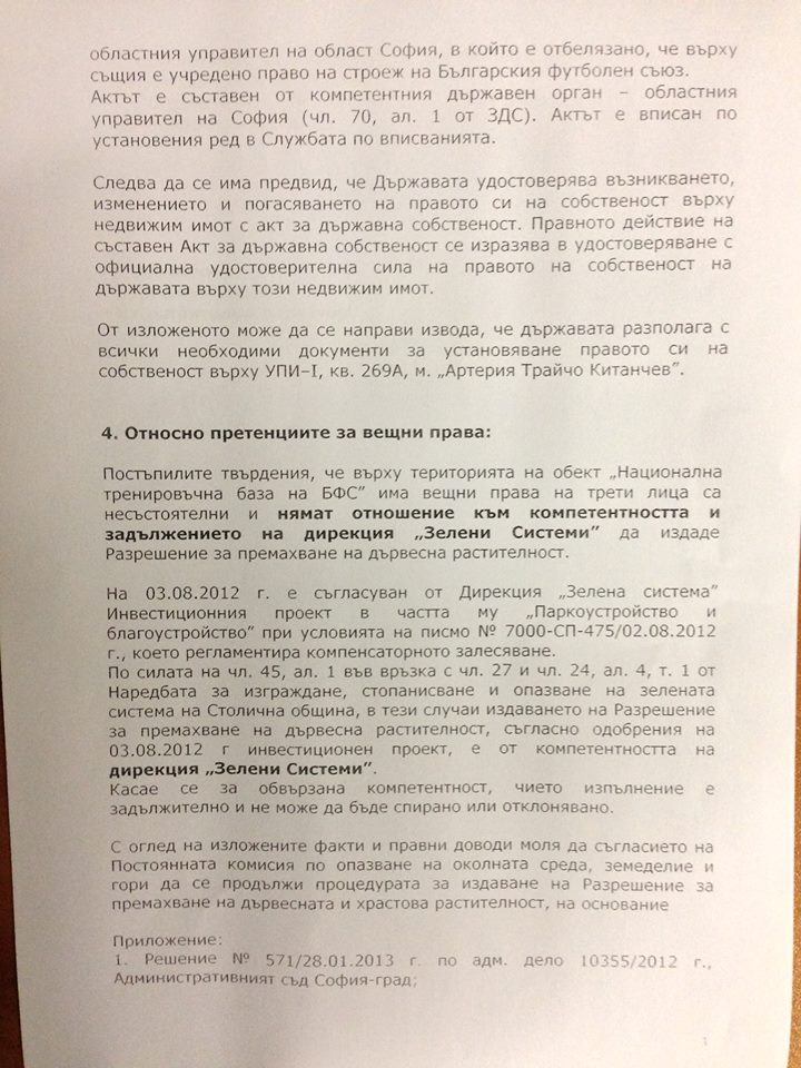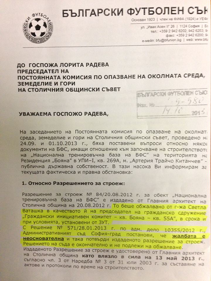 Единствените изисквания на комисията са - Дирекция „Зелена система“ да определи броя на дърветата, които да бъдат засадени от БФС, както и допълнително озеленяване. От представените ни документи става ясно, че съдът вече е разрешил на БФС да строи базата и никоя организация няма правото да спре строежа. Земята е държавна и ще остане такава дори и след края на договора за собственост, който изтича след 28 години. Независимо че парите за „Национална тренировъчна база на БФС“ се предоставят изцяло от УЕФА, терените винаги ще бъдат държавна собственост, а не на БФС.