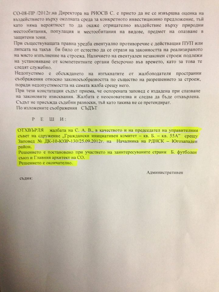 Втората жалба е срещу правото на строеж на БФС. Въпросната жалба е отхвърлена от съда като „недопустима“ на 28.01.2013 г. Според документа законите са спазени и строежът не може да бъде възпрепятстван.