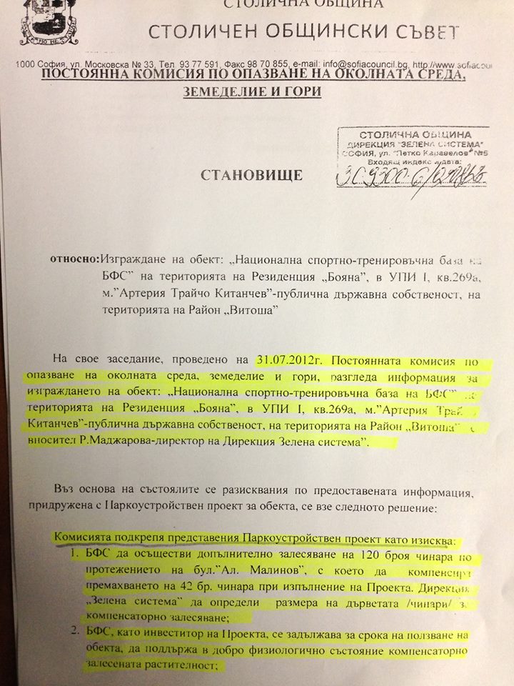 Това е становището на Комисията по опазване на околната среда към СОС в подкрепа на проекта на БФС. Тук се описват и конкретните ангажименти за озеленяване и грижа от страна на БФС за сметка на футболната централа: