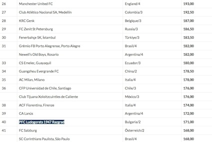 Българският шампион Лудогорец е на 40-о място в света за изминалата 2013 година. Класацията е на Международната федерация по футболна история и статистика (IFFHS). Подреждането на федерацията се прави въз основа на всички официални мачове на отбора за календарната година, през която тимът от Разград постигна значителни успехи в България и Лига Европа. Лудогорец е единственият български тим сред 200-те класирани.
