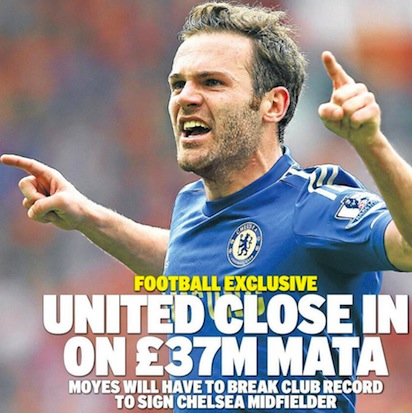 Манчестър Юнайтед е на крачка от истински трансферен удар. "Червените дяволи" водят преговори с Челси за Хуан Мата и според "The Telegraph" шансовете да се стигне до сделка са много големи. Изданието твърди, че шампионите са готови да платят 37 млн. паунда за испанския национал, който от началото на сезона не се ползва с диверието на Жозе Моуриньо. От "Олд Трафорд" още не са изпратили официална оферта, но ръководните фактори в клуба са одобрили идеята за привличането на Мата. Ако то стане факт, Юнайтед ще счупи трансферния си рекорд. До момента най-скъпата покупка на английския гранд е Димитър Бербатов, привлечен за 30,7 млн. паунда от Тотнъм през 2008 година.