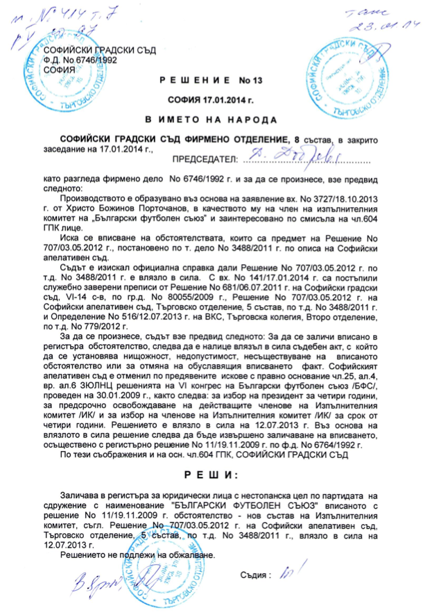 Предстои общо събрание (Конгрес) на Българския футболен съюз на 14.02.2014 г. Убеден съм, че всички Вие - клубовете в системата на БФС, сте подготвени за най-висшия футболен форум, на който ще проведем дискусия за предизвикателствата и бъдещето пред най-популярната игра. В тази връзка бих искал да Ви информирам, че със свое решение от 17.01.2014 г. Софийски градски съд извърши вписване на Изпълнителния комитет на БФС в състав от периода преди провеждането на VI Конгрес на 30.01.2009 г. По същество това не променя нищо, тъй като президентът, както и по-голямата част от състава на досегашния Изпълнителен комитет остават същите. Подготовката за провеждането на върховния футболен форум продължава по план и Ви очаквам в работно настроение на 14.02.2014 г. в зала 3 на НДК."