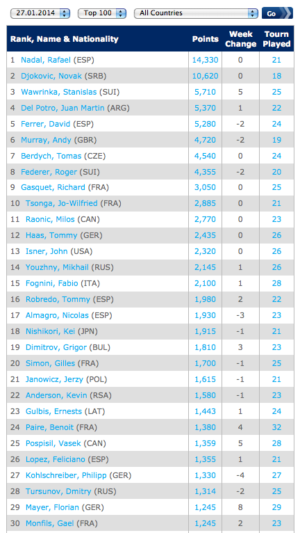 Най-голям прогрес сред първите 20 обаче прави шампионът от Мелбърн Станислас Вавринка. Швейцарецът, който до миналата седмица заемаше 8-ото място в ранглистата, вече е трети с 5710 точки, веднага след финалиста Рафаел Надал (14 330) и Новак Джокович (10 620), когого елиминира на 1/4-финалите.