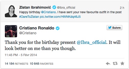 Златан Ибрахимович изпробва чувството си за хумор на гърба на Кристиано Роналдо навръх 29-ия му рожден ден. Ибра изпрати на португалеца тишърт от новата колекция на Найки "Dare to Zlatan" (Осмели се да бъдеш Златан), чието лице е той. Постъпката си шведът популяризира чрез Туитър.