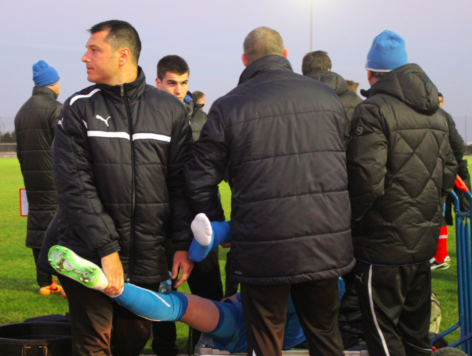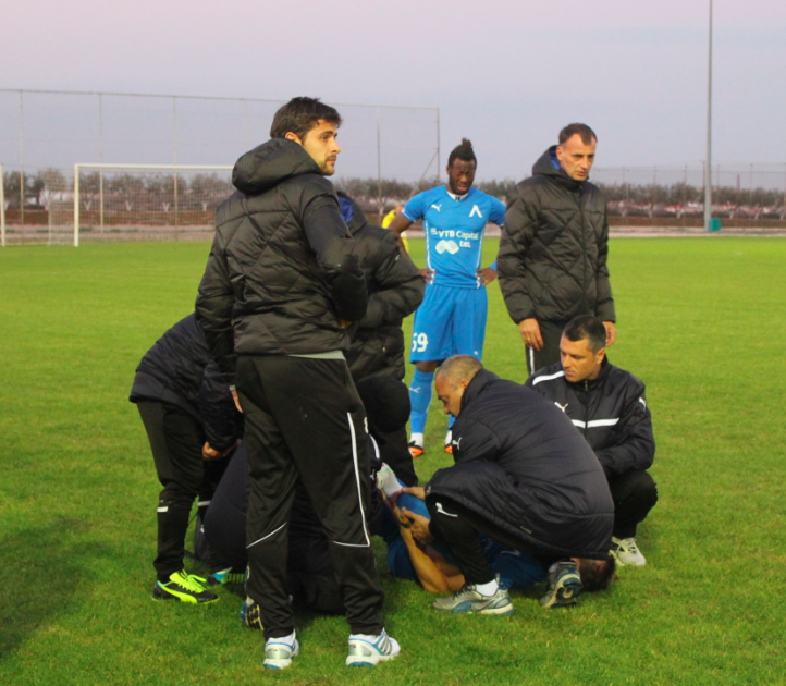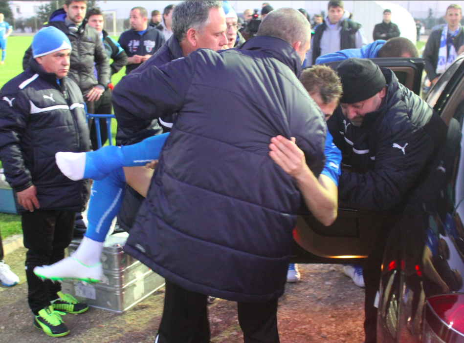 На всичкото отгоре край терена нямаше и линейка и футболистът бе откаран с автомобил на един от сините фенове към близка болница. Заедно с него замина и лекарят на тима д-р Михаил Илиев, както и един от масажистите на тима.