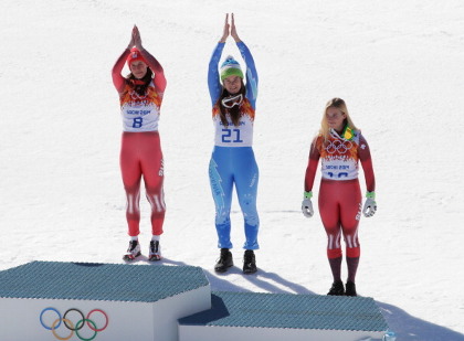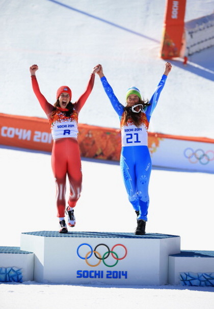 Две са шампионките в спускането от програмата на ски-алпийските дисциплини на Олимпийските игри в Сочи. Златото спечелиха словенската звезда Тина Мазе и швейцарката Доминик Гизин, които дадоха равно първо време: 1:41.57 минута. Бронза спечели друга швейцарка - младата и много талантлива Лара Гут, която остана на 10 стотни зад победителките. Шампионката от суперкомбинацията и водачка в генералното класиране за Световната купа Мария Хьофъл-Рийш (Германия) днес нямаше ден и остана едва 13-а, но повече от секунда след победителките.