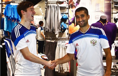 Вчера в Москва беше представен новият резервен екип, с който националният отбор на Русия ще играе на световното първенство в Бразилия. Водещ на церемонията беше известният футболен коментатор Константин Генич, а ролята на манекени се превъплатиха халфовете на Локомотив (Москва) Александър Самедов и Алексей Миранчук.